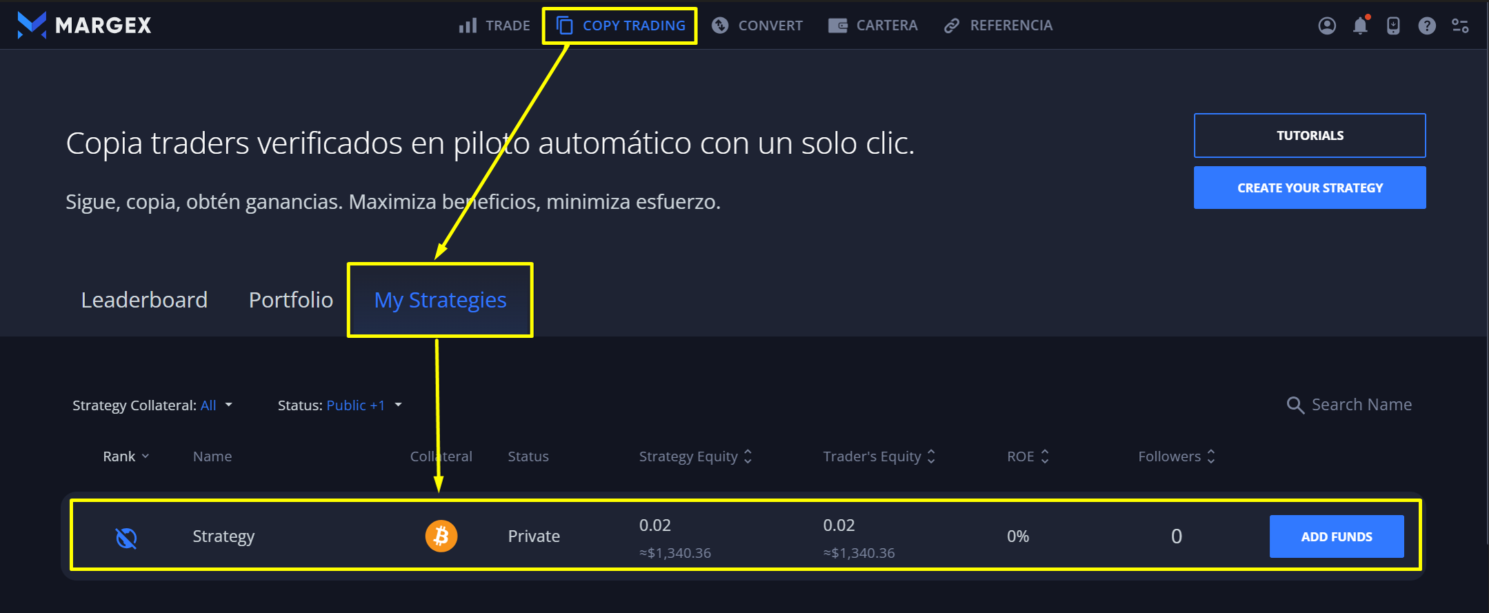 Ve a la página de Copytrading y haz clic en "CREAR TU ESTRATEGIA":