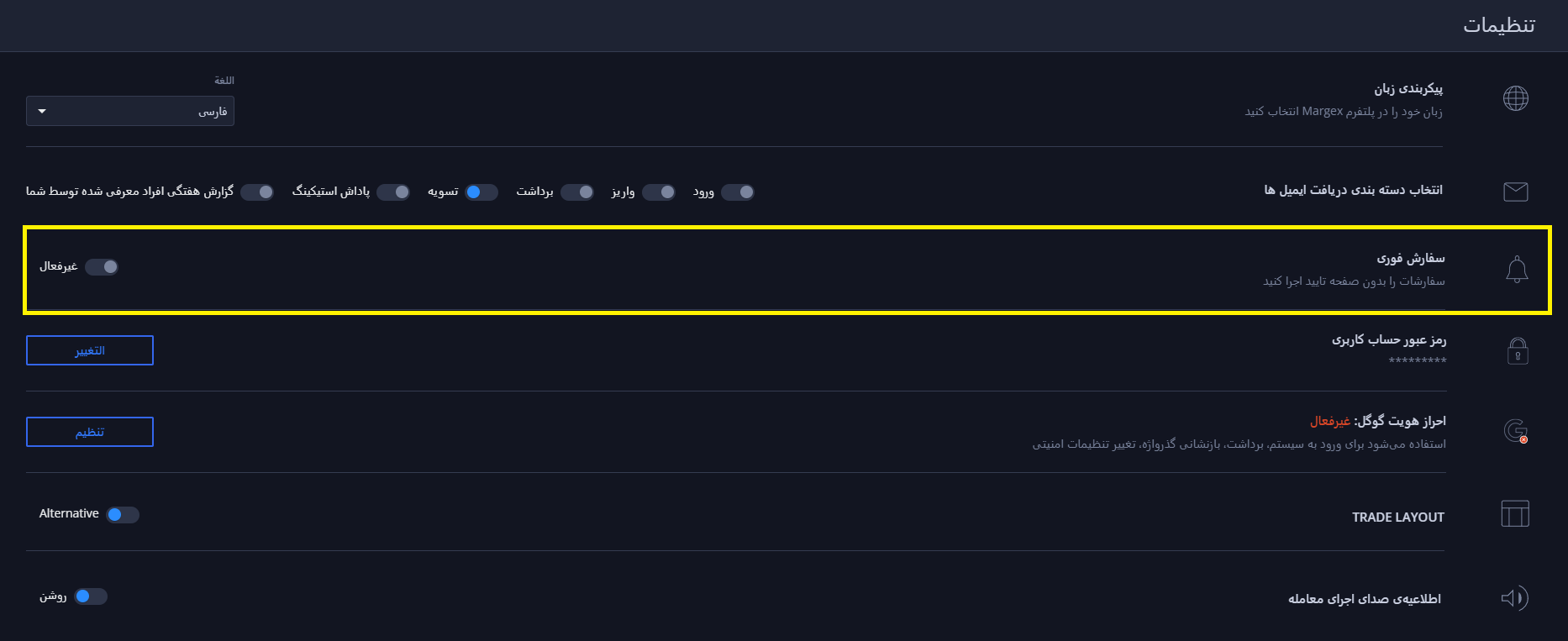 این ویژگی به معامله‌گران اجازه می‌دهد تا با **حذف تمام پنجره‌های تأیید سفارش**، سفارش‌ها را سریع‌تر ثبت و مدیریت کنند، مانند: