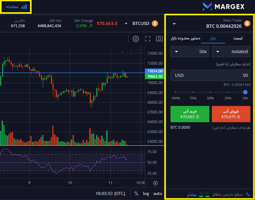 7. **اندازه سفارش** - اندازه کامل سفارش شما در ارز وثیقه انتخاب شده