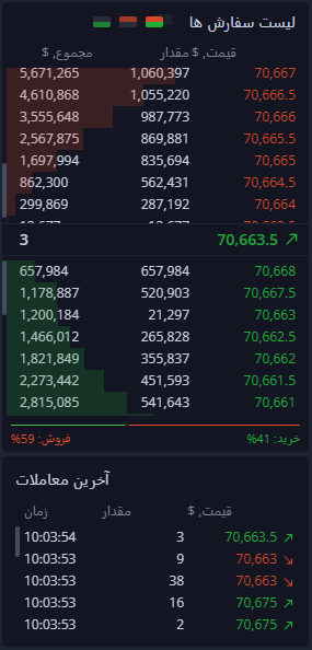 * نمودار، اوردر بوک و آخرین معاملات (به رنگ بنفش مشخص شده است)