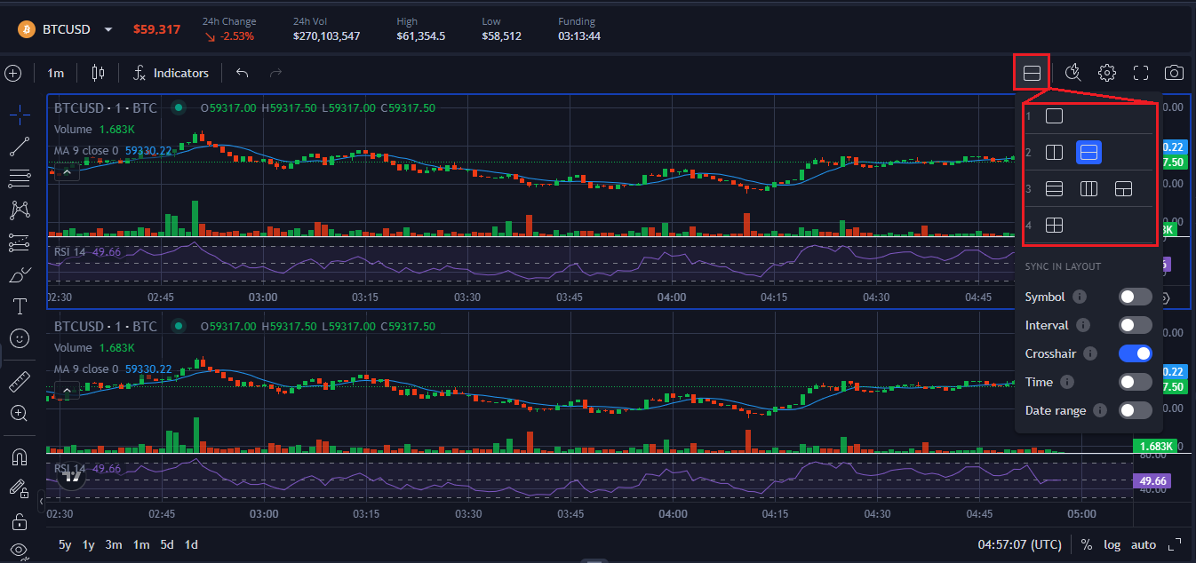 * برای انتخاب چیدمان نمودار چندگانه خود، کافی است بر روی دکمه گزینه‌های چیدمان در گوشه سمت راست بالای ماژول نمودار کلیک کرده و تعداد نمودارها و چیدمان آنها را انتخاب کنید تا در صفحه معامله شما نمایش داده شود: