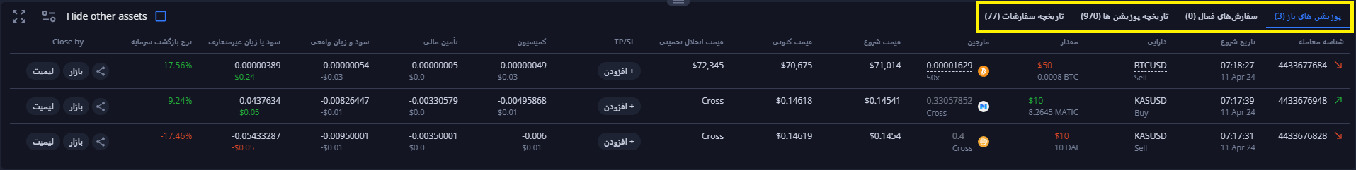 در اینجا معامله گران می توانند سفارشات فعال و موقعیت های باز را مدیریت کنند. این ماژول به راحتی قابل تنظیم است و به معامله‌گران اجازه می‌دهد ستون‌های اطلاعات مورد نظر را اضافه/حذف کنند، سفارش‌ها و پوزیشن ها را بر اساس تاریخ فیلتر کنند و همچنین تاریخچه سفارش‌ها و پوزیشن‌ها را مشاهده کنند.