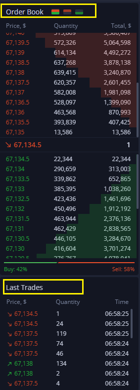 Le **carnet d'ordres** et le **module des dernières transactions** sont des outils cruciaux lors du trading, car ils fournissent aux traders des informations directes sur la profondeur actuelle du marché, les intentions des traders et la volatilité.