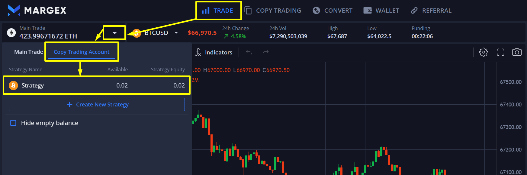 2. Per iniziare a fare trading con la tua strategia, vai alla [pagina di trading](https://margex.com/app/trade) e clicca sul pulsante del menu a discesa per aprire la finestra di selezione della strategia. Successivamente, clicca sulla strategia desiderata per iniziare a fare trading: