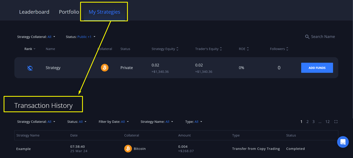 Inoltre, la sezione **Cronologia delle transazioni** delle strategie può essere trovata qui. Contiene informazioni dettagliate su tutte le transazioni relative alle tue strategie, compresi i tuoi depositi/prelievi e le ricompense: