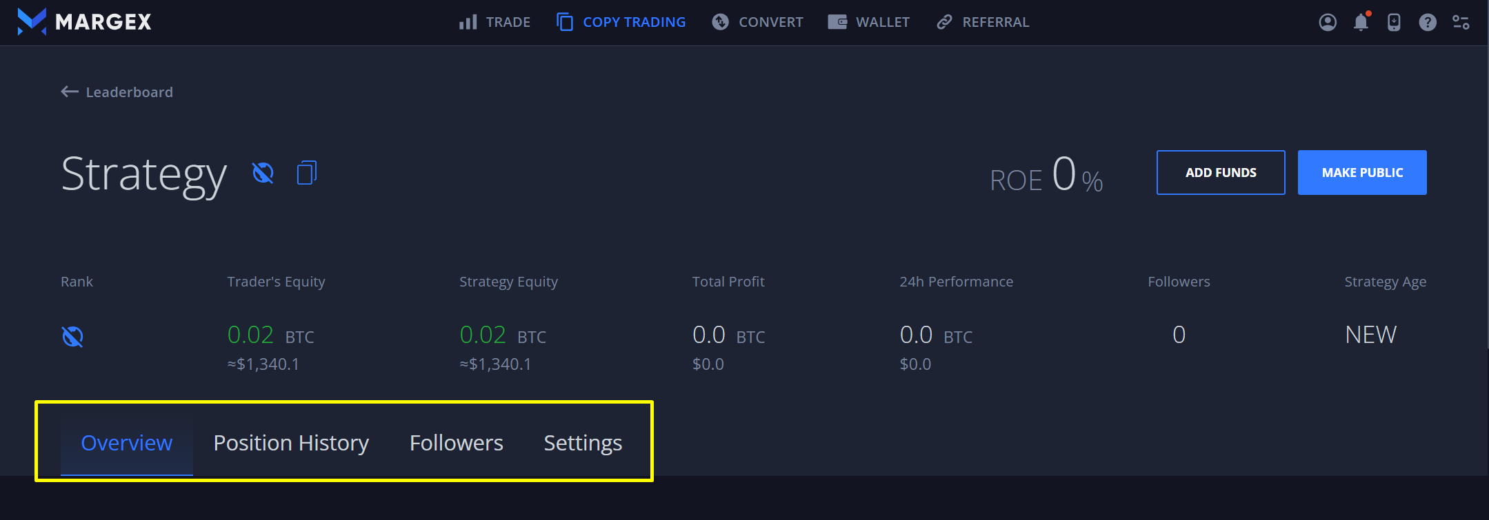 1. Clicca su una strategia per visualizzare la pagina principale della strategia. Qui i trader possono regolare i [parametri della strategia](https://help.margex.com/help-center/it/copy-trading/traders/strategy-settings) e le impostazioni della strategia, rivedere la cronologia delle posizioni, i dettagli dei follower, ecc.