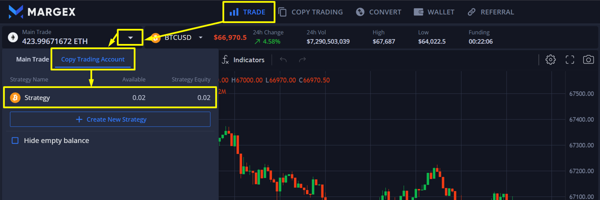 6. Per iniziare a fare trading con la tua strategia, vai alla[ pagina di trading](https://margex.com/app/trade) e clicca sul pulsante del menu a discesa per aprire la finestra di selezione della strategia. Successivamente, clicca sulla strategia desiderata per iniziare a fare trading: