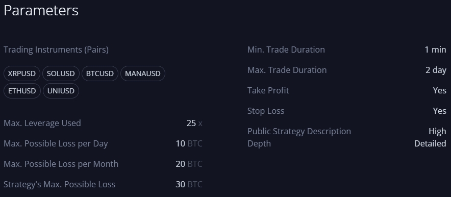 Se sei un Follower e desideri rivedere la descrizione/gli aspetti tecnici di una strategia, basta fare clic su quella strategia nella classifica del copy trading e scorrere fino al modulo dei Parametri: