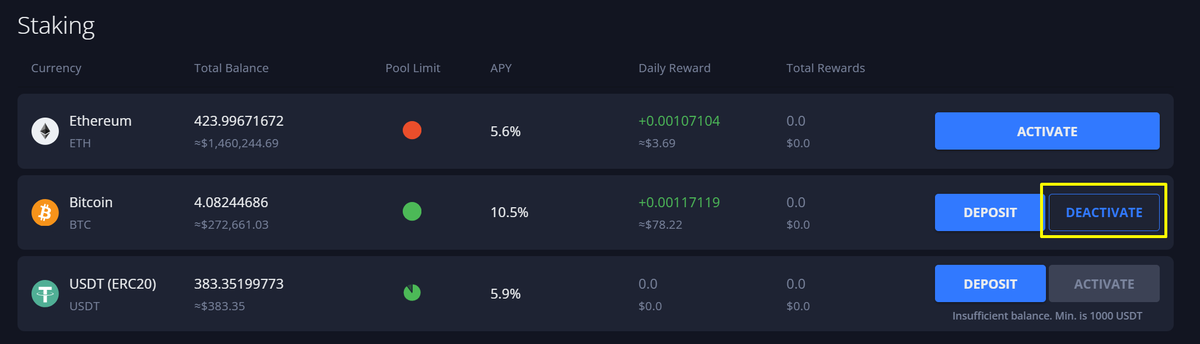 * Nella scheda Staking fare clic sul pulsante Disattiva:
