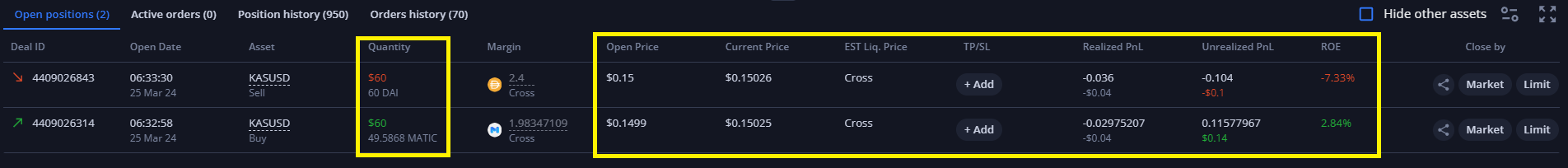 동일한 거래 쌍(KAS/USD), 시장 방향(숏 또는 롱), 마진 화폐(MATIC 및 DAI)를 공유하는 또 다른 주문이 실행되면, 기존 포지션과 즉시 결합되어 초기 포지션 크기가 $60으로 증가하며, ROE, 진입 가격, 실현 및 미실현 손익이 이에 따라 영향을 받게 됩니다.