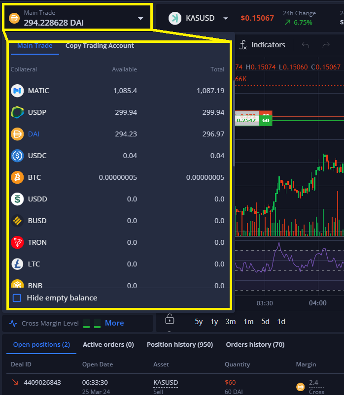‘거래’ 페이지에서 현재 사용 가능한 잔액을 확인하려면, 페이지 왼쪽 상단의 담보 버튼을 클릭하면 됩니다.