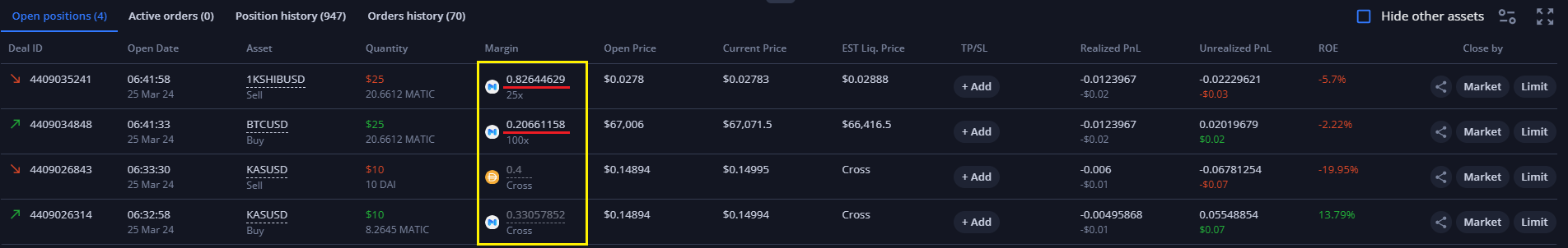 1. ‘열린 포지션’ 섹션의 ‘마진’ 열에서 포지션의 마진 값을 클릭합니다.