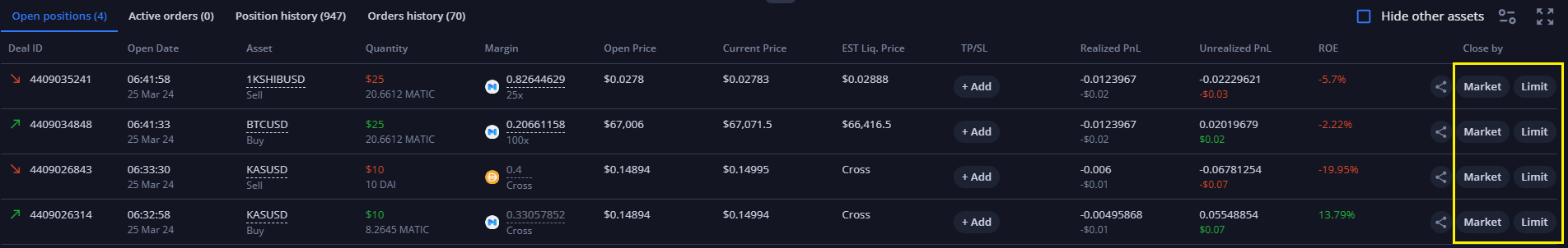 * **부분 포지션 종료** - 포지션의 1%에서 99%까지 종료할 수 있습니다. (예: 거래 크기가 $100일 경우, 40%를 종료하면 포지션 크기가 $40 감소하고, 이 부분의 수익/손실이 정산됩니다. 남은 60%($60)는 계속 활성 상태로 유지되며 PnL을 생성합니다.)