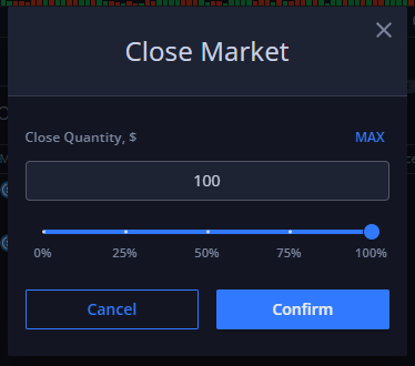 포지션 종료 확인 창에서 포지션을 전체(100%) 또는 부분(1%\~99%)으로 종료할 수 있습니다: