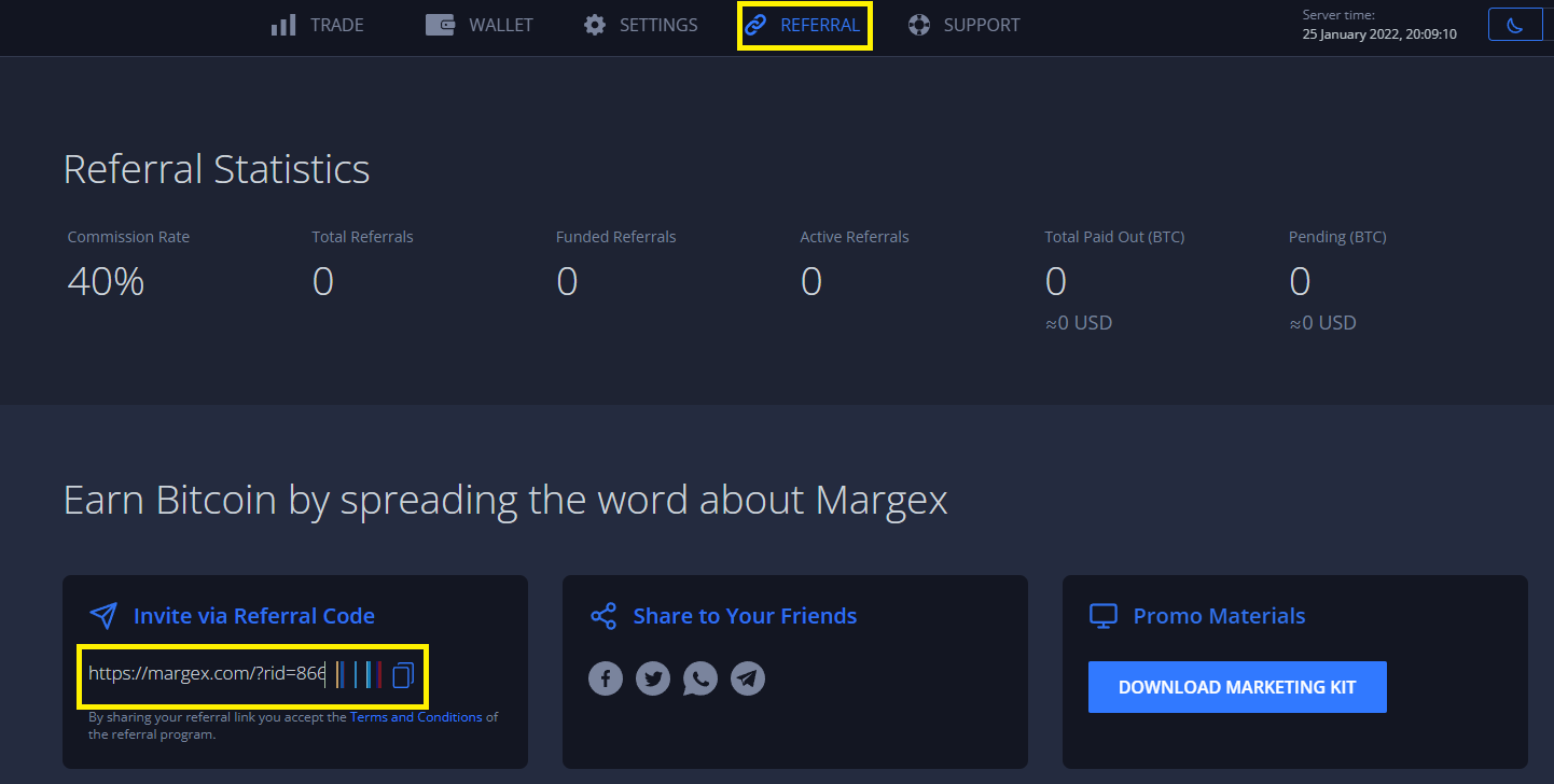 Na página [Indicações ](https://margex.com/app/referral)da sua conta, você encontra detalhes e estatísticas básicas da sua rede de indicações, o status de pagamentos das suas indicações, bem como materiais adicionais, como um Kit de Marketing, para ajudá-lo a expandir sua rede de indicações e aumentar seus ganhos!