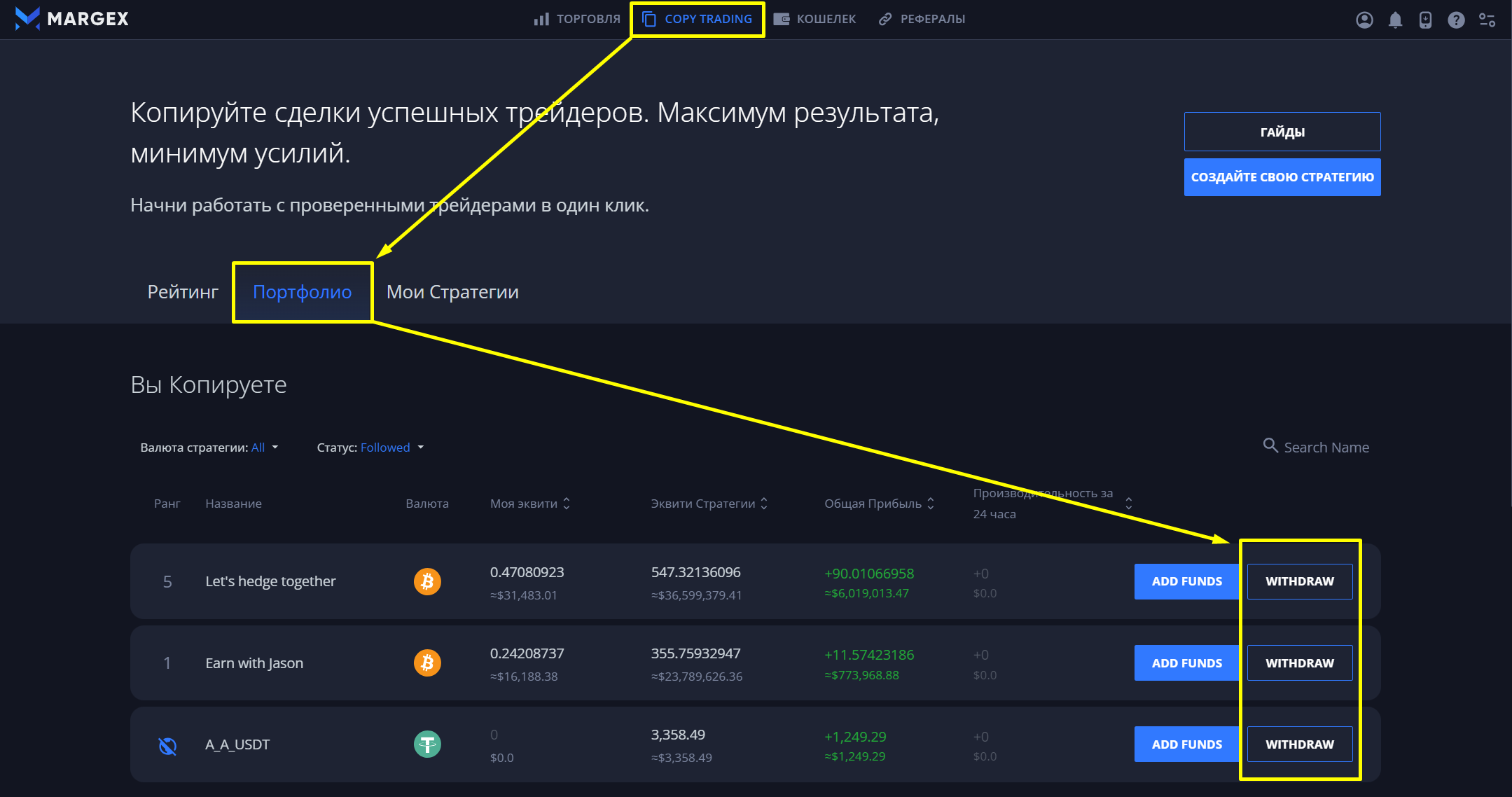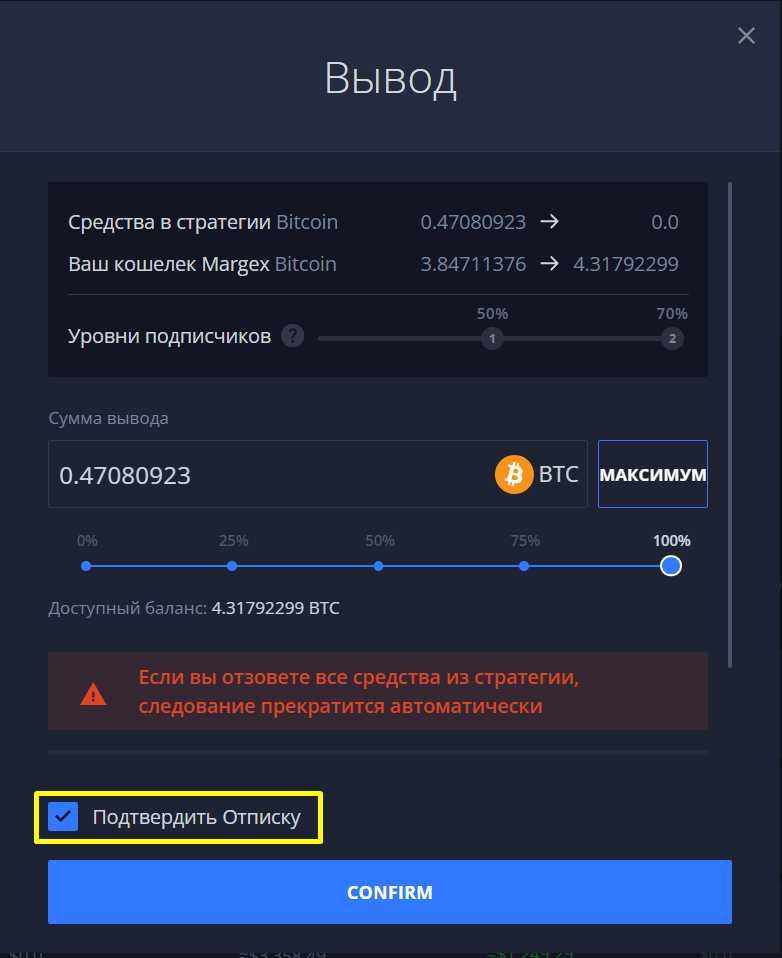 Чтобы отписаться от стратегии: 1. Перейдите в "Портфолио" 2. Выберите стратегию, от которой вы хотите отписаться, и нажмите "ВЫВЕСТИ" 3. Выберите полную сумму средств и подтвердите отписку.