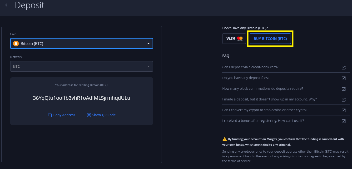 To purchase BTC (or other crypto) with a bank card using Changelly, navigate to the [Wallet](https://margex.com/app/wallet) page.