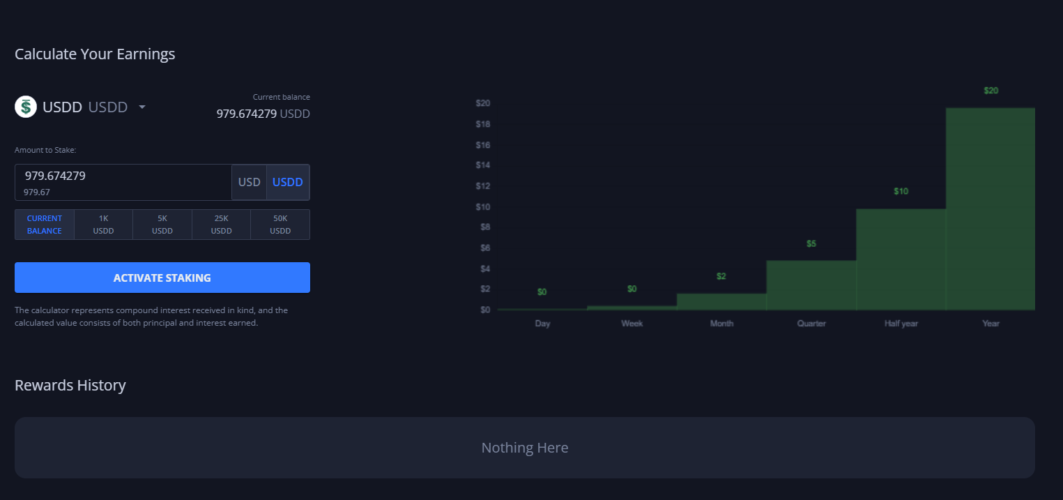 The 'Staking' tab reflects information about staked currencies including - currently staked currencies, APY% calculator, reward creditation history