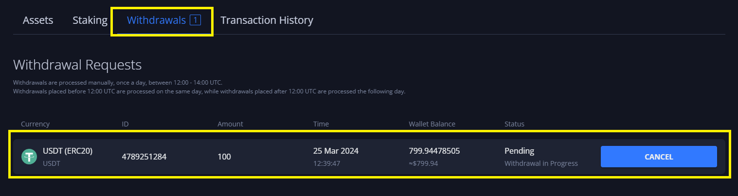 After cancelling a withdrawal, the funds reserved for the withdrawal are unlocked in your Wallet and can be used for further trading, copy trading or staking.
